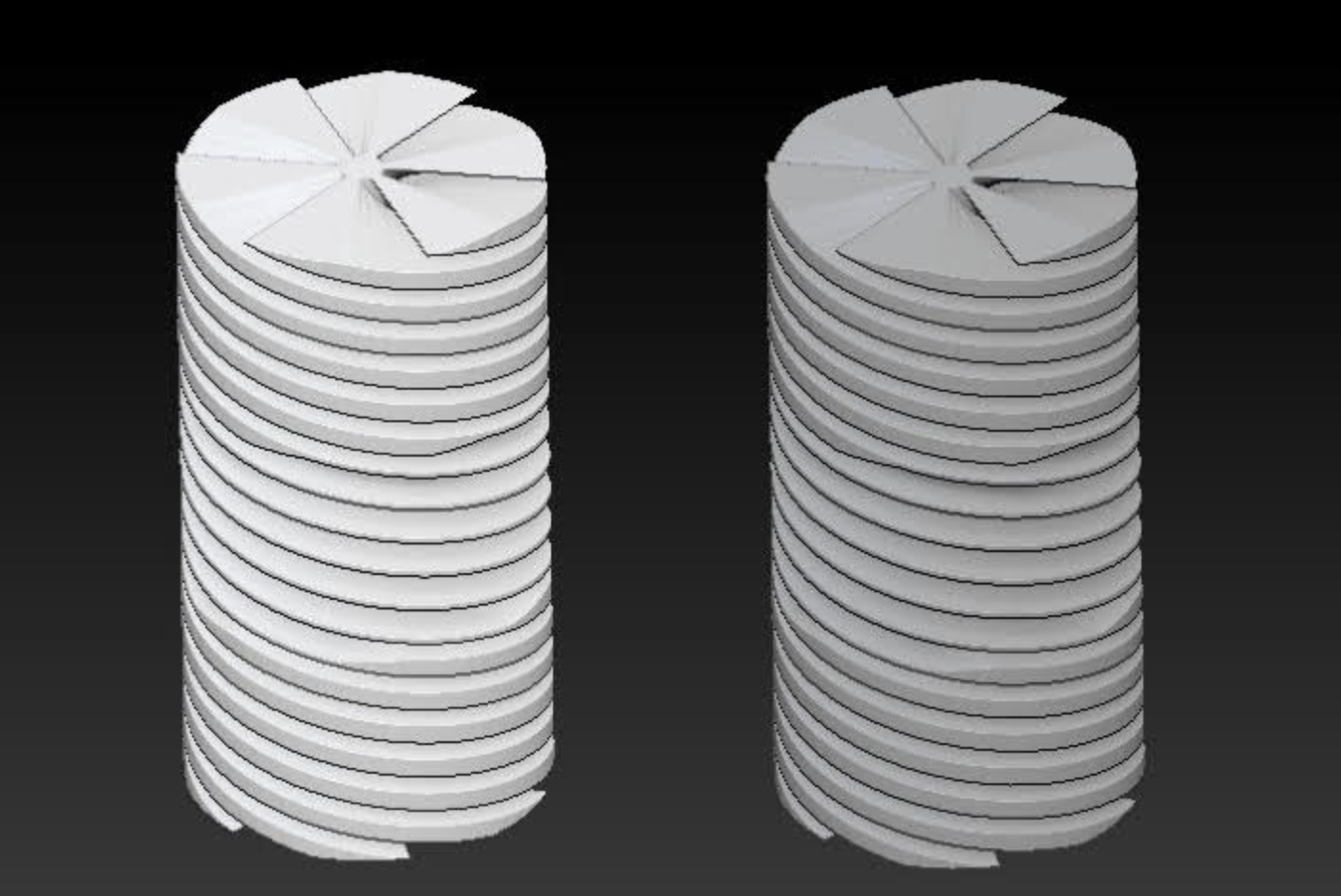 Printed internal part of the Gro Genie showing how the spin changes by varying the distance between the fins